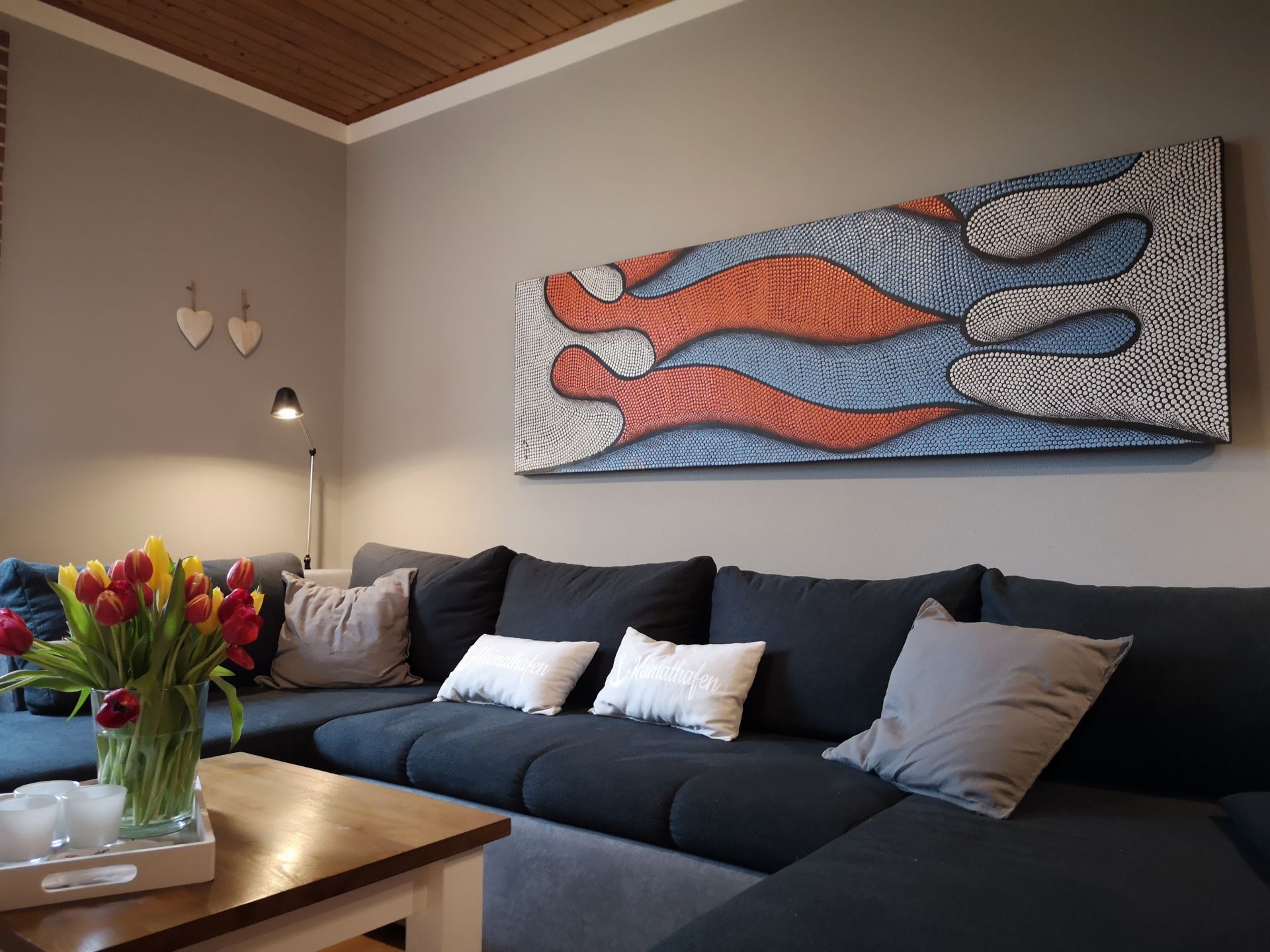 - 1 Wohnzimmer mit XXL- Sofa, 55“ TV, Regal, HiFi-Anlage